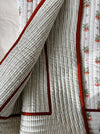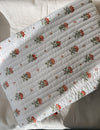 Hand block printed reversible quilt have our Blume print on one side and a faded green or red stripe on the other. The Single Size fits generously into a cot and also works very well as a playmat. Please note, each quilt is entirely unique as there will be natural irregularities in the print due to the hand block printing process.